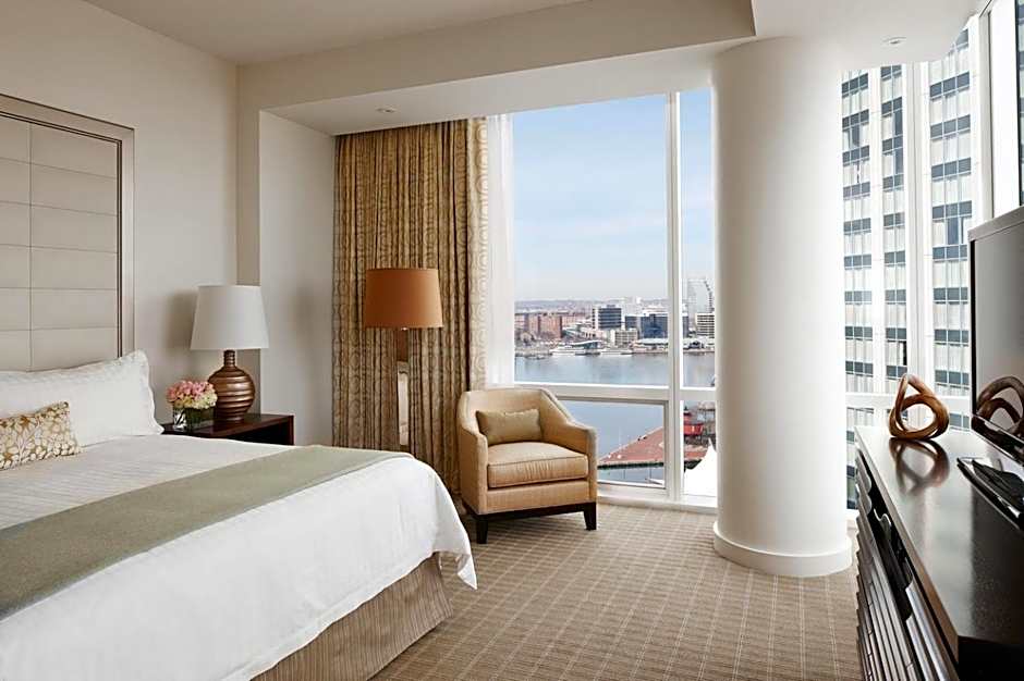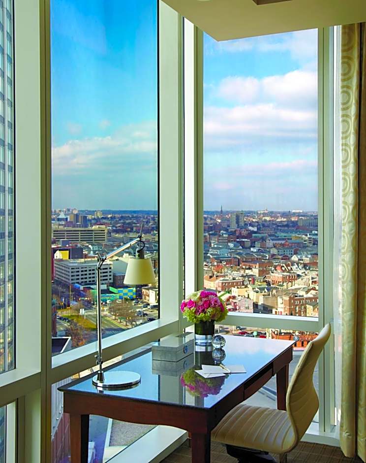 This room features a bird-eye view of Baltimore's Inner Harbor through floor to ceiling windows, as well as a living room and flat-screen TV.