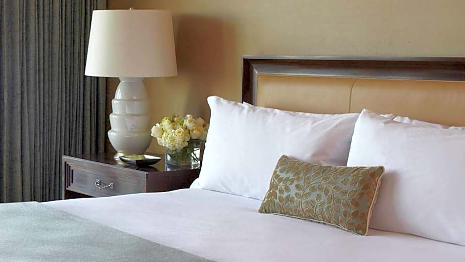 This spacious suite has a home theater system, additional bathroom, floor-to-ceiling windows, and a seating area.